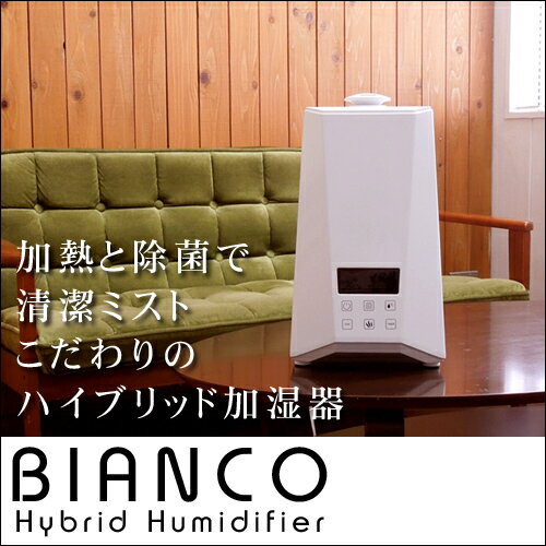 商品名 BIANCO Hybrid Humidifier / ビアンコ ハイブリッド加湿器 定格電圧 AC100V 50/60Hz 消費電力 【超音波モード】最少18W〜最大30W、【ウォームモード】最少98W〜最大110W 加湿量(約) 500ml(4段階調節) 連続使用時間(約) 10時間 最大適用範囲(参考値) 木造8.5畳、プレハブ洋室14畳 外形寸法(約) 幅21×奥行23×高36.5cm 重量(約) 2.19kg 電源コード長(約) 1.2m タンク容量 5.8L 動作音(約) 35db 材質 ABS、PP 付属品 水質浄化カートリッジ×1、取扱説明書(保証書付) 保証期間 ご購入日から1年間 ご注意 ・ウォームモードでも熱くはならないミストになります。