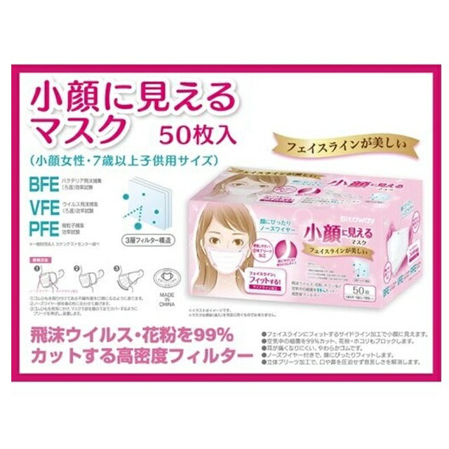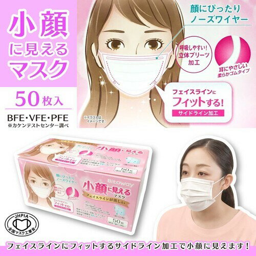 フェイスラインにフィットするサイドライン加工で小顔に見えます! ・飛沫ウイルス、ハウスダスト、かぜ、花粉、PM2.5等のミクロ粒子をしっかり補足する不織布の3層構造フィルターを使用。